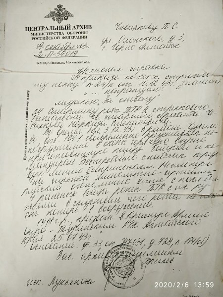 В приказе по 201-му стрелковому полку №24/н от 10.12.1943 г. значится: «… награждаю: