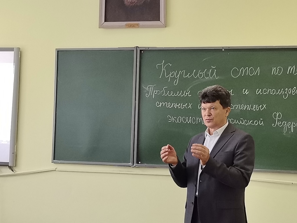 Модератором круглого стола выступил руководитель научно-исследовательской лаборатории доктор сельскохозяйственных наук, профессор кафедры географии и природопользования Горно-Алтайского государственного университета Михаил Иванович Яськов. Он выступил с приветственным словом, где обозначил основную повестку, представил общую информацию о проблемах охраны и использования степных и полупустынных экосистем Российской Федерации.